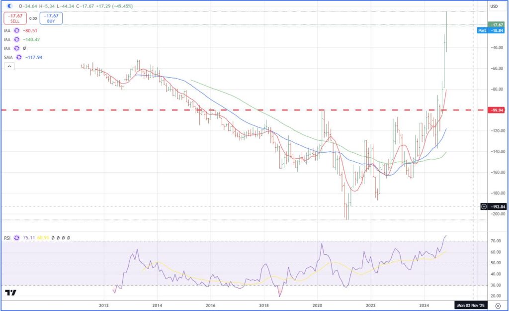 Let’s broaden the analysis next. One of two posts. Here are two charts that compare the Big Guys to the little people. The first chart using monthly data goes back to 2011 when Bernanke unleashed funny money. What you see is the Big Guys had a difficult time during the Trump term, 2016 to 2020. And then with the FED / Administration money flood in March 2020, they found the secret, to utilize pricing power i.e. inflation, to run the board, especially after July 2024. Their peak comparison versus the little people was on November 6, 2024.