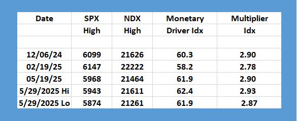 It is probably instructive to see what occurred with the basics on April 7, 2025 when the SPX hit a 4835 low. At that very time the Market Monetary Driver index hit the high for the year at 63.1 basically the five factors adjusted to the situation and made the stock market a buy. At the very same time the Multiplier Index hit the low for the year at 2.40, basically the animal spirits were wrung out that morning.