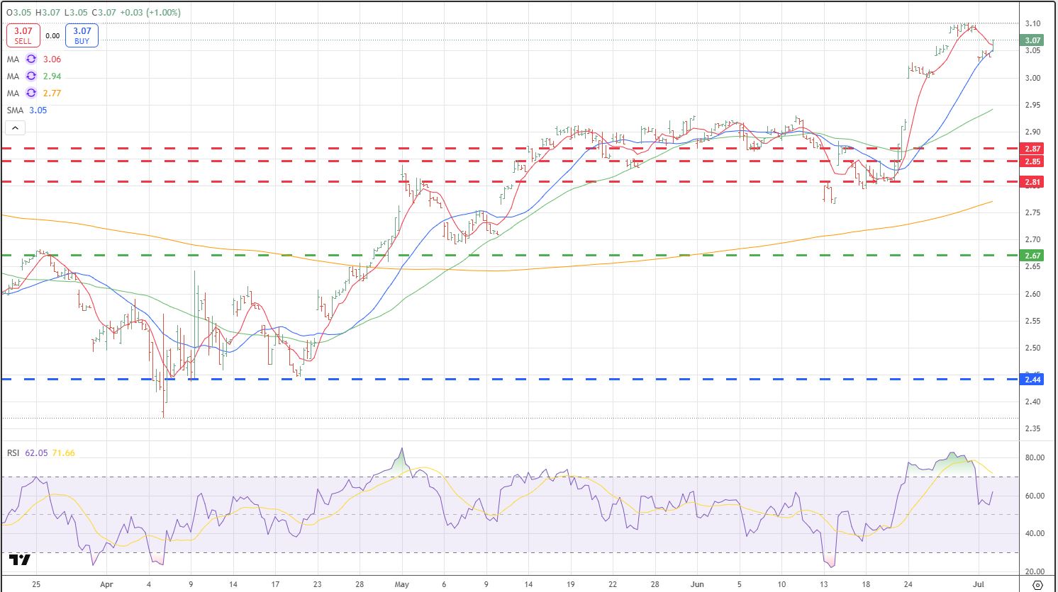 At the moment I am in the process of doing a mid-year update, hope to post on July 7th. It seems like the thing that jumps out to me at this juncture while doing this analysis is the “Animal Spirits” work that I have done in the past and talk about a lot here, i.e. the Market Multiplier index. Here is the daily trading version of that index, using two-hour bars. What you see in the chart is the June 24th upside breakout of the December Biden high of 2.94. Since then the chart had a short-term stall at 3.10 and a little backoff yesterday to 3.03 and now a modest bump up to 3.07.
